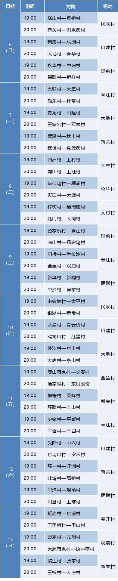 A versenyt kilenc versenyzónában tartották: Minlian falu a Dongzhou részlegben; Dadi Village, Jinzhu falu és Guanqian Village (Zhougongwu) a Yinhu alterületben; Chunjiang Village és Shanjian Village a Chunjiangi részlegben; Yüan falu Xindeng városában; a Changlv város kosárlabda csarnoka; és Xinguan falu Dayuan városában - Ebben az évben még több ember képes lesz megnézni az izgalmas játékokat közvetlenül a küszöbön.